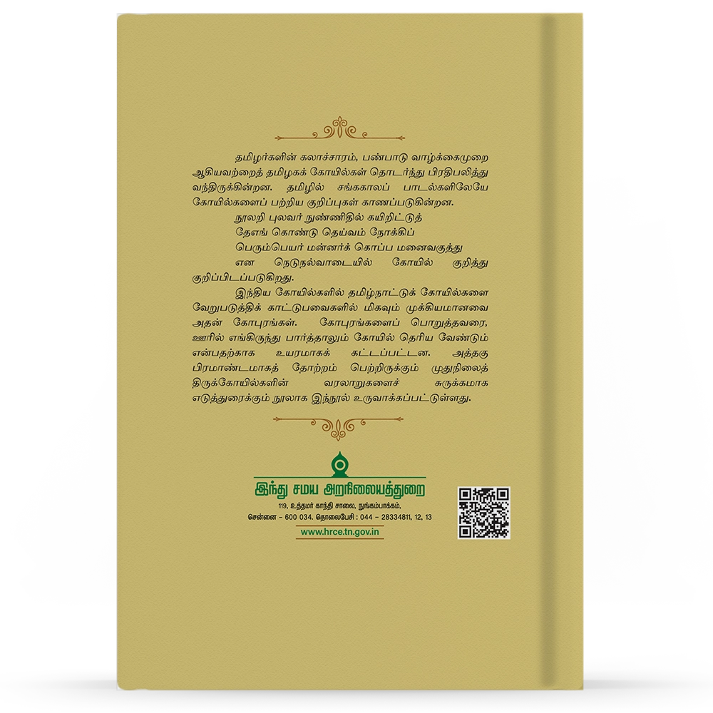 என நெடுநல்வாடையில் கோயில் குறித்து குறிப்பிடப்படுகிறது. இந்திய கோயில்களில் தமிழ்நாட்டுக் கோயில்களை வேறுபடுத்திக் காட்டுபவைகளில் மிகவும் முக்கியமானவை அதன் கோபுரங்கள். கோபுரங்களைப் பொறுத்தவரை, ஊரில் எங்கிருந்து பார்த்தாலும் கோயில் தெரிய வேண்டும் என்பதற்காக உயரமாகக் கட்டப்பட்டன. அத்தகு பிரமாண்டமாகத் தோற்றம் பெற்றிருக்கும் முதுநிலைத் திருக்கோயில்களின் வரலாறுகளைச் சுருக்கமாக எடுத்துரைக்கும் நூலாக இந்நூல் உருவாக்கப்பட்டுள்ளது.