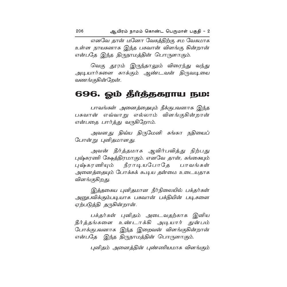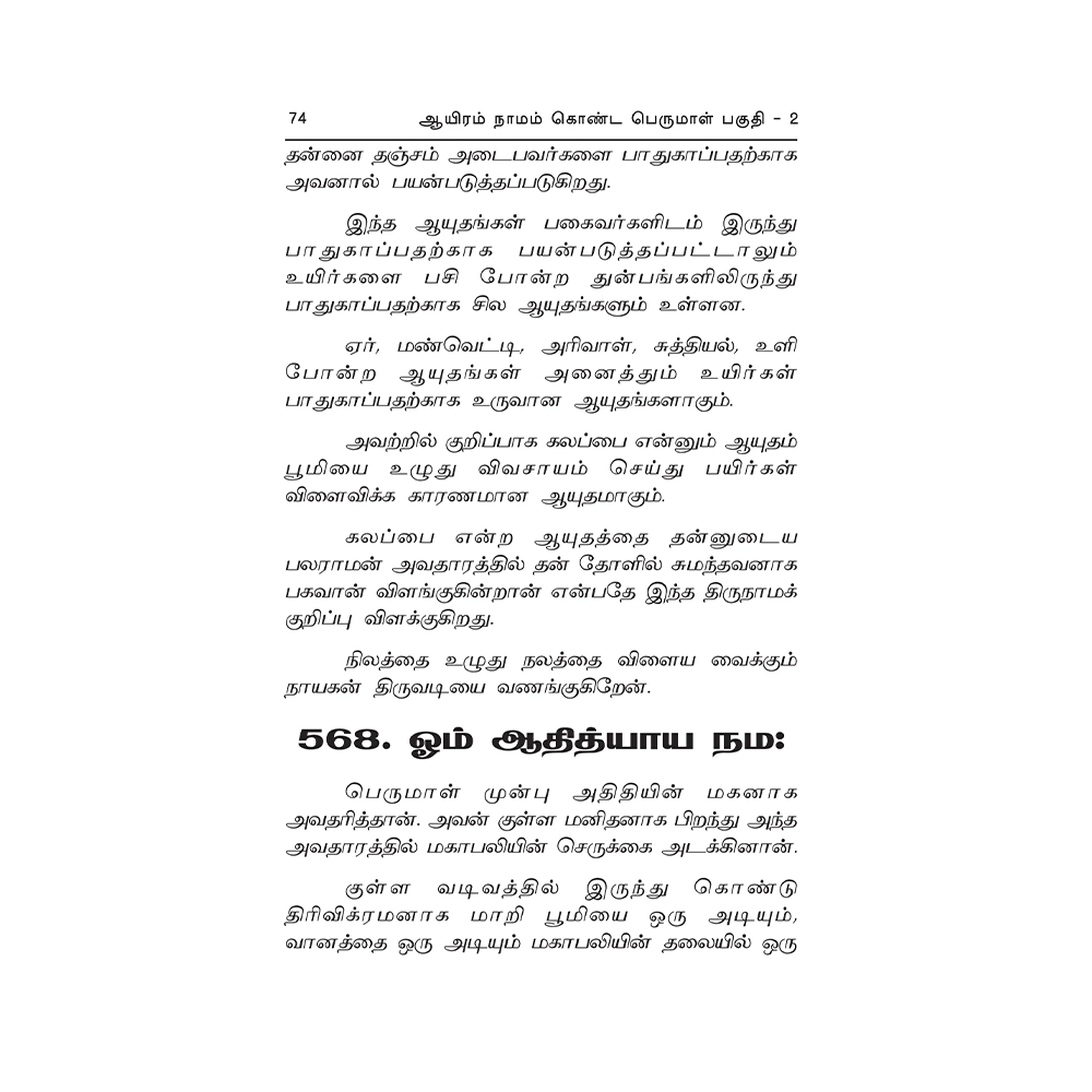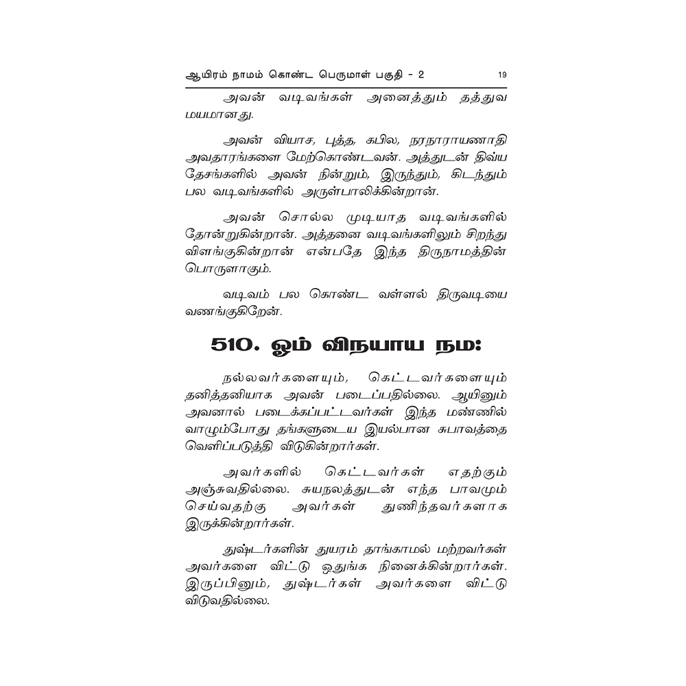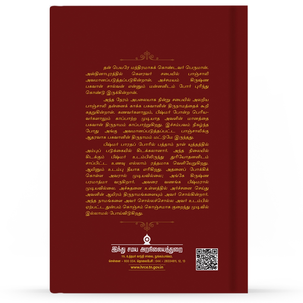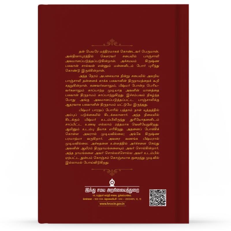 பீஷ்மர் பாரதப் போரில் பத்தாம் நாள் யுத்தத்தில் அம்புப் படுக்கையில் கிடக்கலானார். அந்த நிலையில் கிடக்கும் பீஷ்மர் உடம்பிலிருந்து துரியோதனனிடம் சாப்பிட்ட உணவு எல்லாம் ரத்தமாக வெளியேறுகிறது. ஆயினும் உடம்பு தீயாக எரிகிறது. அதனைப் போக்கிக் கொள்ள அவரால் முடியவில்லை; அங்கே கிருஷ்ண பரமாத்மா வருகிறார். அவரை வணங்க பீஷ்மரால் முடியவில்லை. அச்சுதனை உள்ளத்தில் அர்ச்சனை செய்து அவனின் ஆயிரம் திருநாமங்களையும் அவர் சொல்கின்றார். அந்த நாமங்களை அவர் சொல்லச்சொல்ல அவர் உடம்பில் ஏற்பட்ட துன்பம் கொஞ்சம் கொஞ்சமாக குறைந்து முடிவில் இல்லாமல் போய்விடுகிறது.