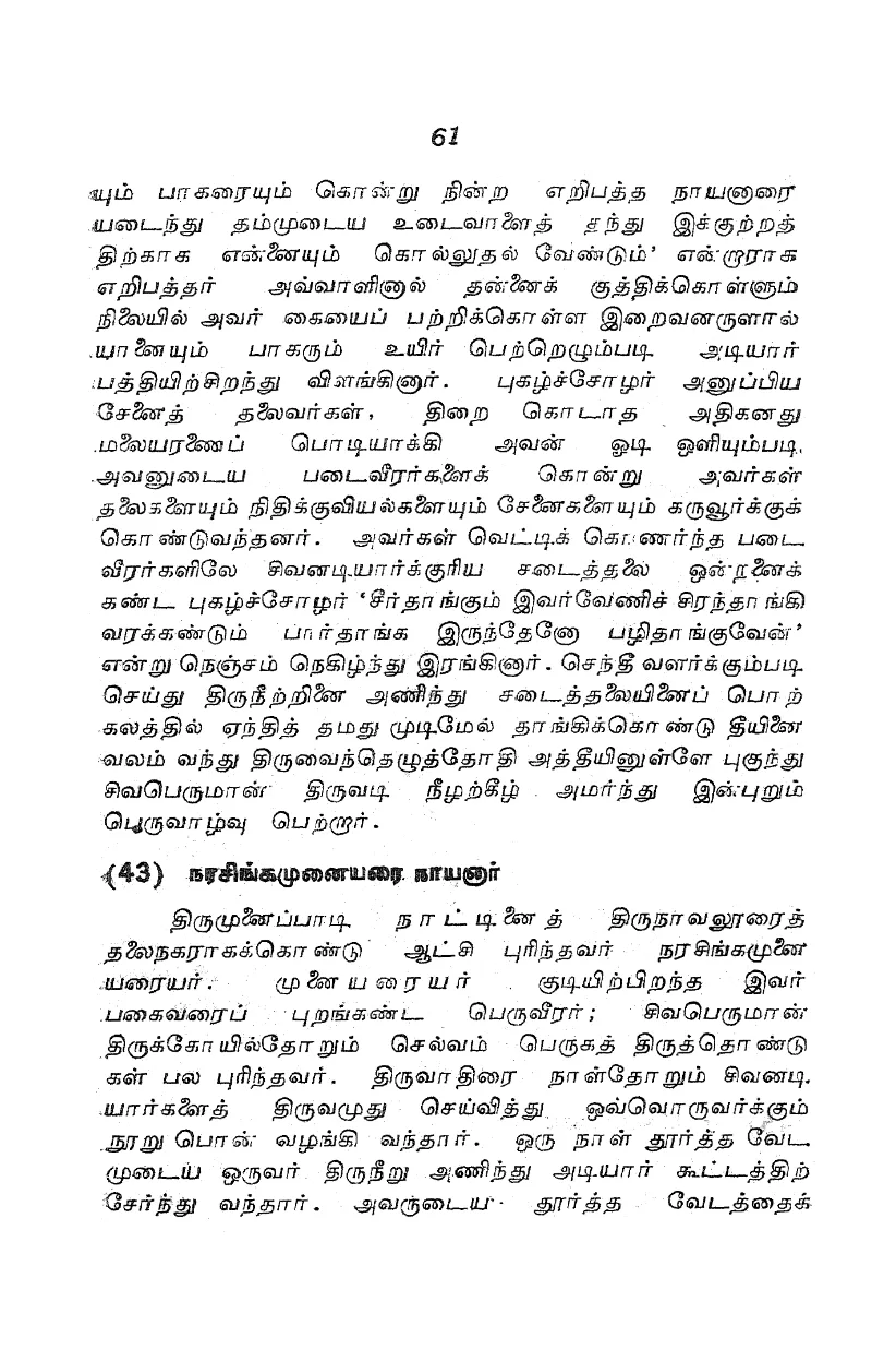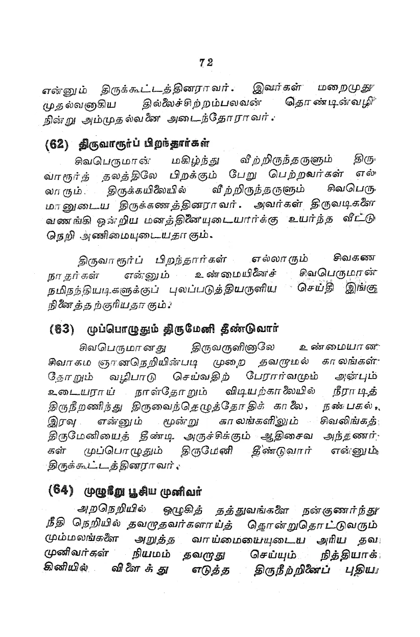 63 நாயன்மார்கள் மற்றும் 9 தொகையடியார்கள் என மொத்தம் 72 பேரை பற்றிய சுருக்க வரலாறாக இந்நூல் உருவாக்கப்பட்டுள்ளது.