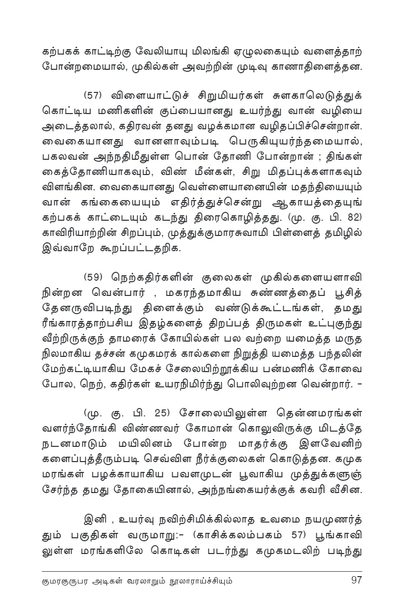 இந்நூலில் குமரகுருபரரின் இளமைப்பருவம், இயற்றிய நூல்கள், அடிகளாரின் அனுபவங்கள், இலக்கிய நடைசிறப்பு போன்றவை விளக்கப்பட்டுள்ளன.